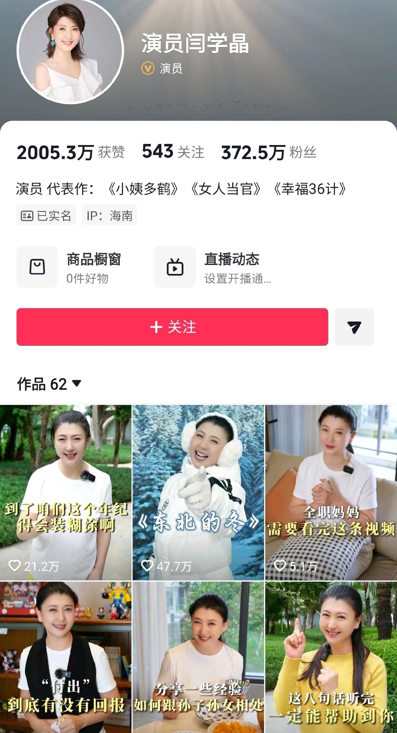 随着影视剧资源减少,闫学晶转向短视频平台发展,依托多年积累的观众基础,迅速吸引超300万粉丝关注。一场直播带货收入,远超拍摄一部电视剧的片酬总额。