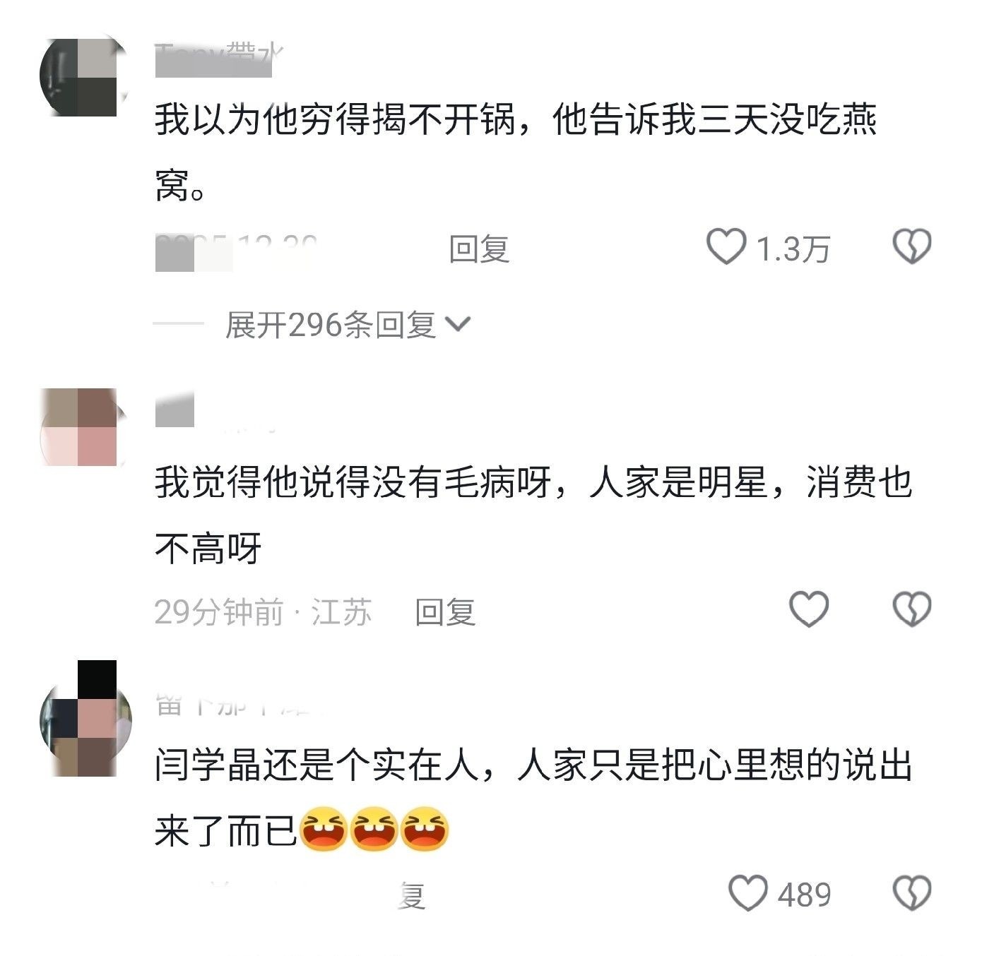 与此同时,闫学晶的“哭穷”也掀起连锁反应,网友陆续翻出其他明星类似“卖惨”名场面,揭露行业惯用套路。